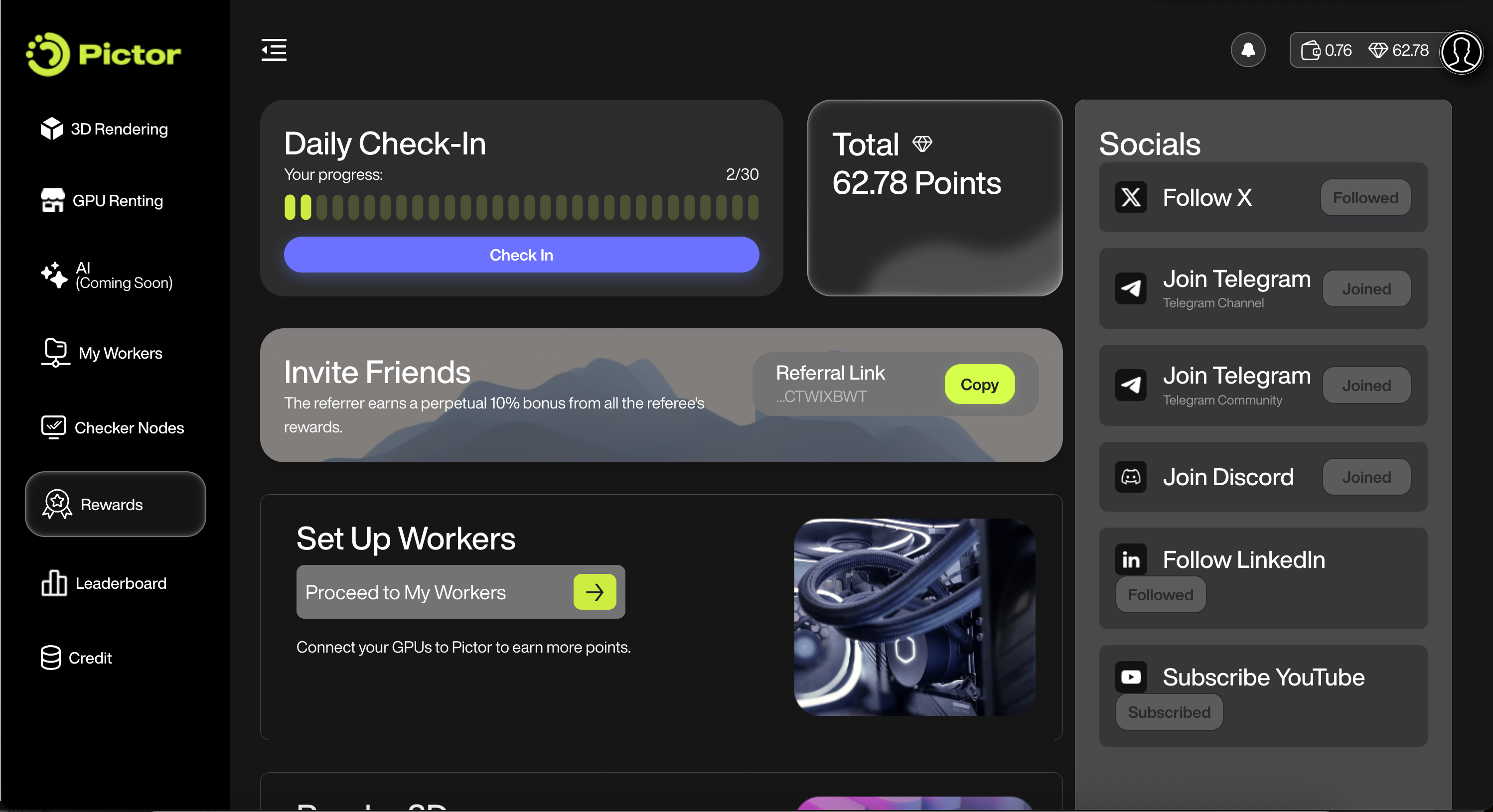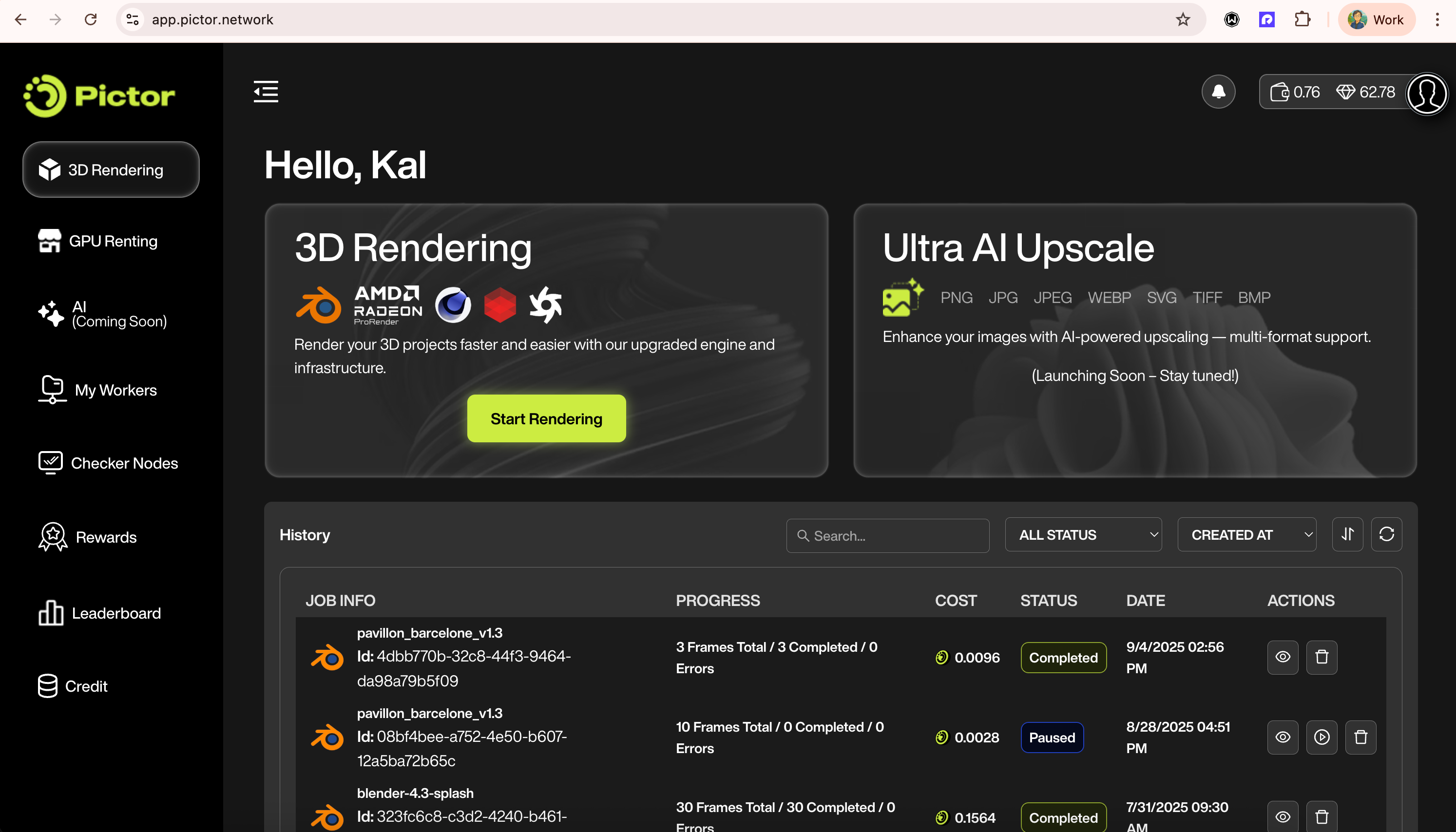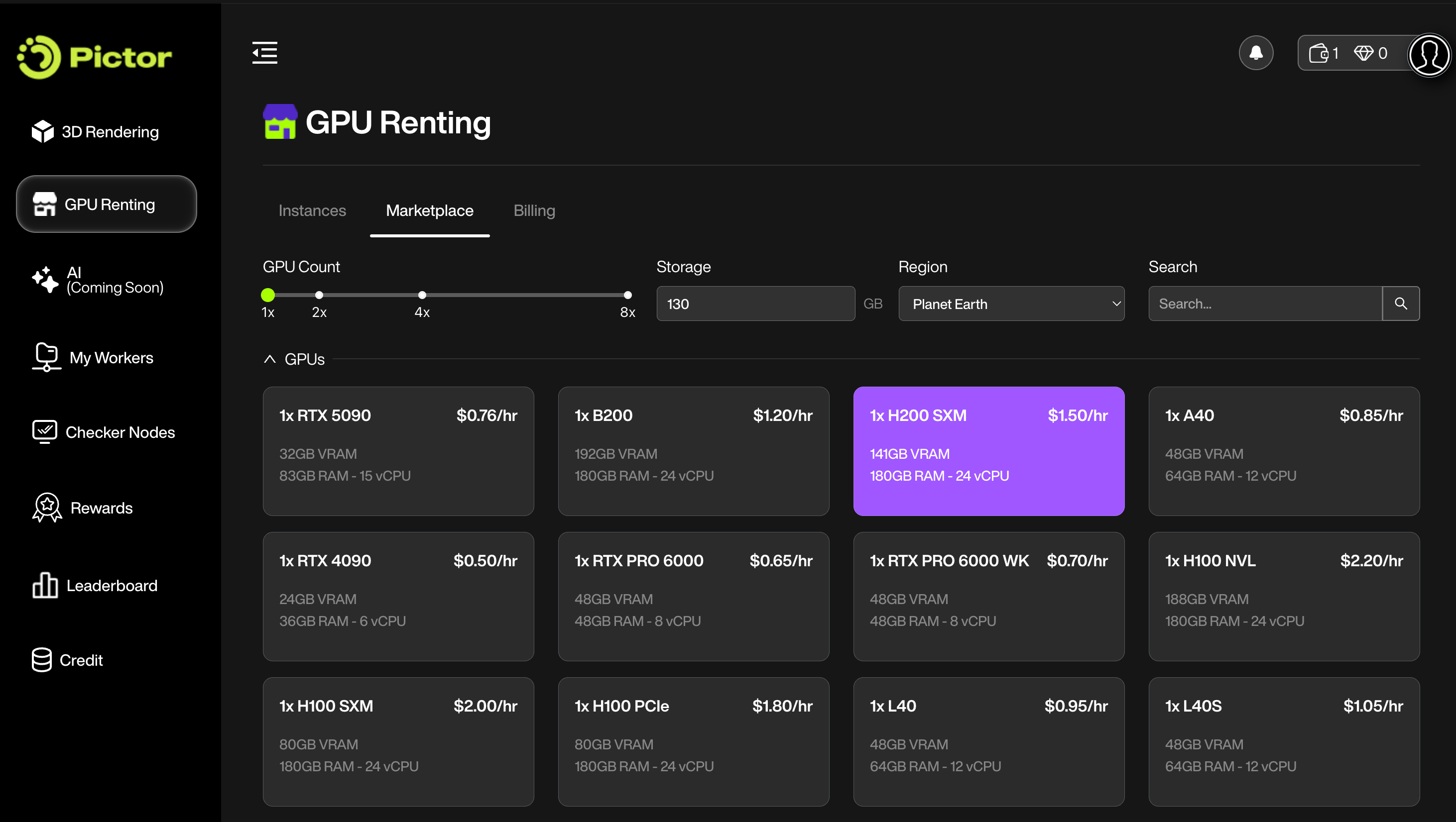 A Decentralized GPU aggregator for 3D rendering & AI workloadPlatformsPictor Network is a decentralized GPU aggregator designed to provide affordable, secure, and high-performance computing power for AI training, inference, and 3D rendering workloads. By connecting GPU providers worldwide—including individual GPU owners, data centers, and professional render farms—Pictor builds an open marketplace that ensures cost efficiency, transparency, and scalability. At its core, Pictor solves two critical challenges: 1. High cost and limited availability of GPUs on traditional cloud providers such as AWS, GCP, or Azure. 2. Fragmentation in rendering and AI computing, where creators and AI engineers often struggle to access suitable GPUs for their specific workloads.
